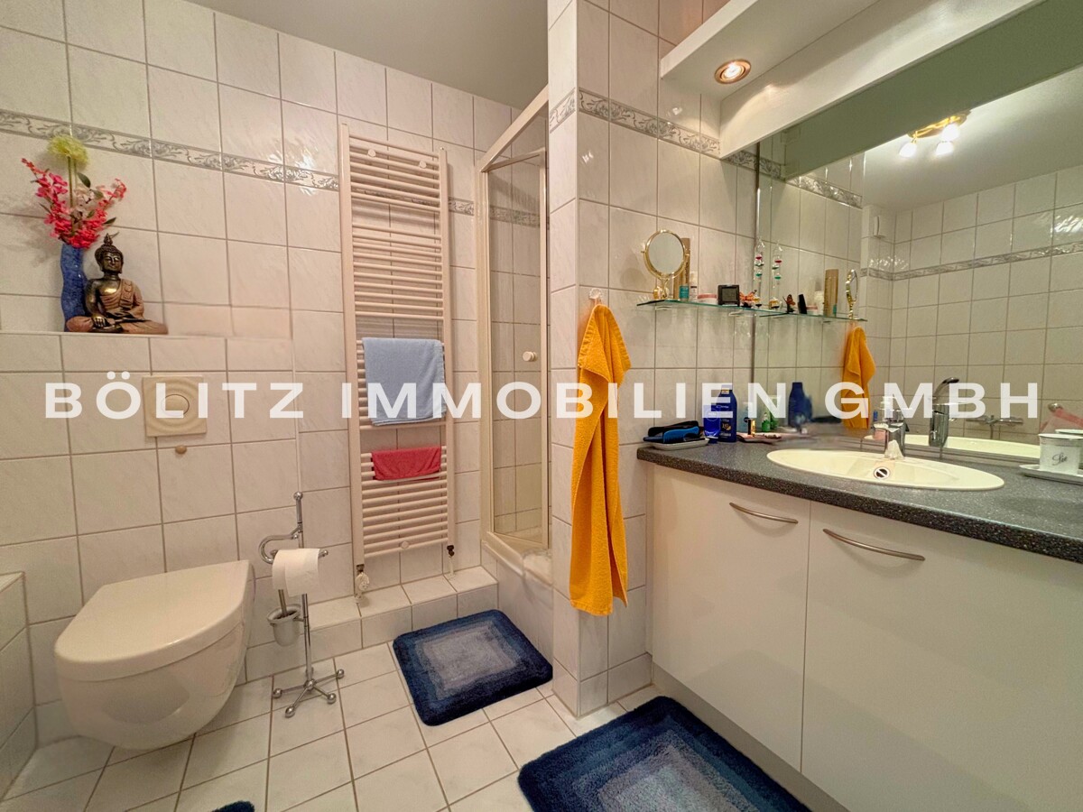 - hochgefliestes Badezimmer mit Dusche sowie Badewanne