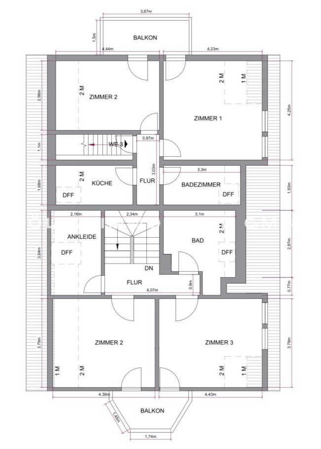 Whg. 3: 2 Zimmer, gefliestes Tageslichtbad, Küche, Flur, Balkon, Spitzboden