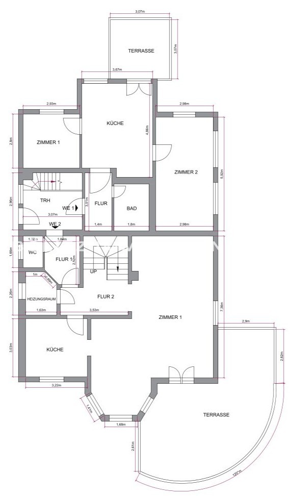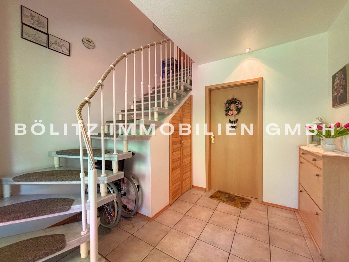 Maisonette-Whg. 2: Küche, Flur, 4 Zimmer, gefliestes Tageslichtbad, separates WC, Heizungsraum, Balkon, Terrasse, Spitzboden