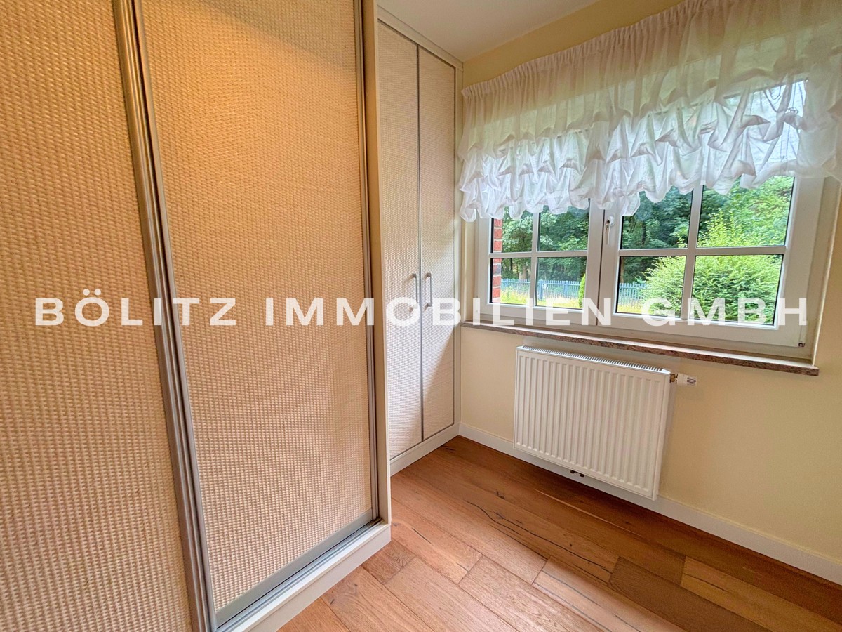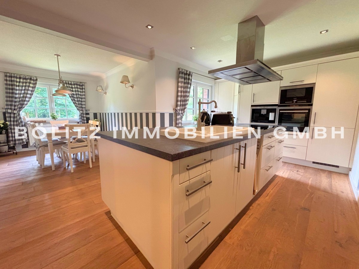 Die stilvolle Einbauküche mit Kücheninsel erfüllt höchste Ansprüche an Funktionalität und Design und lädt zum gemeinsamen Kochen und Genießen ein. Im Schlafzimmer schließt sich ein Ankleidezimmer mit maßgefertigten Einbauschränken an.